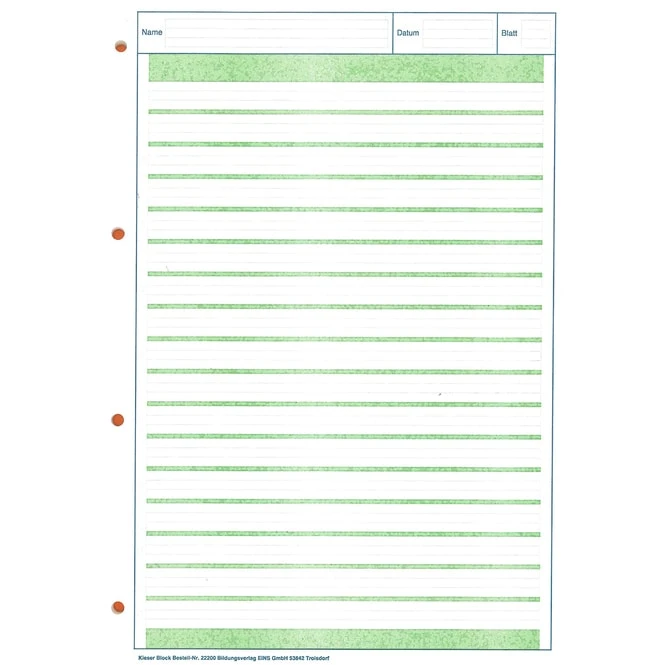 Mit dem Kieserblock Lineatur 2 können Schüler in der 2. Klasse ihre Schreibfähigkeiten verbessern und trainieren. Durch die Kontrastlineatur fällt das Schreiben leichter, da eine gewisse Eingrenzung der Linien entsteht. Dadurch können Schüler die Größen der Buchstaben besser einschätzen und schreiben. Dieser Kieser-Block Nr. 02 liniert ist 4-fach gelocht wodurch Arbeitsblätter sauber in Ordner abgeheftet werden.